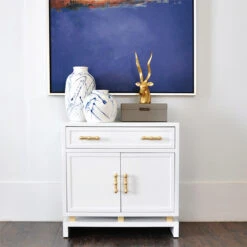 Worlds Away Marcus White Lacquer 1 Drawer, 2 Door Nightstand With Gold Leafed Bamboo Hardware And Gold Leaf Metal Detail