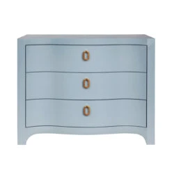 Worlds Away Curved Front Chest – Three Drawers – White Textured Linen – Satin Brass Ring Hardware