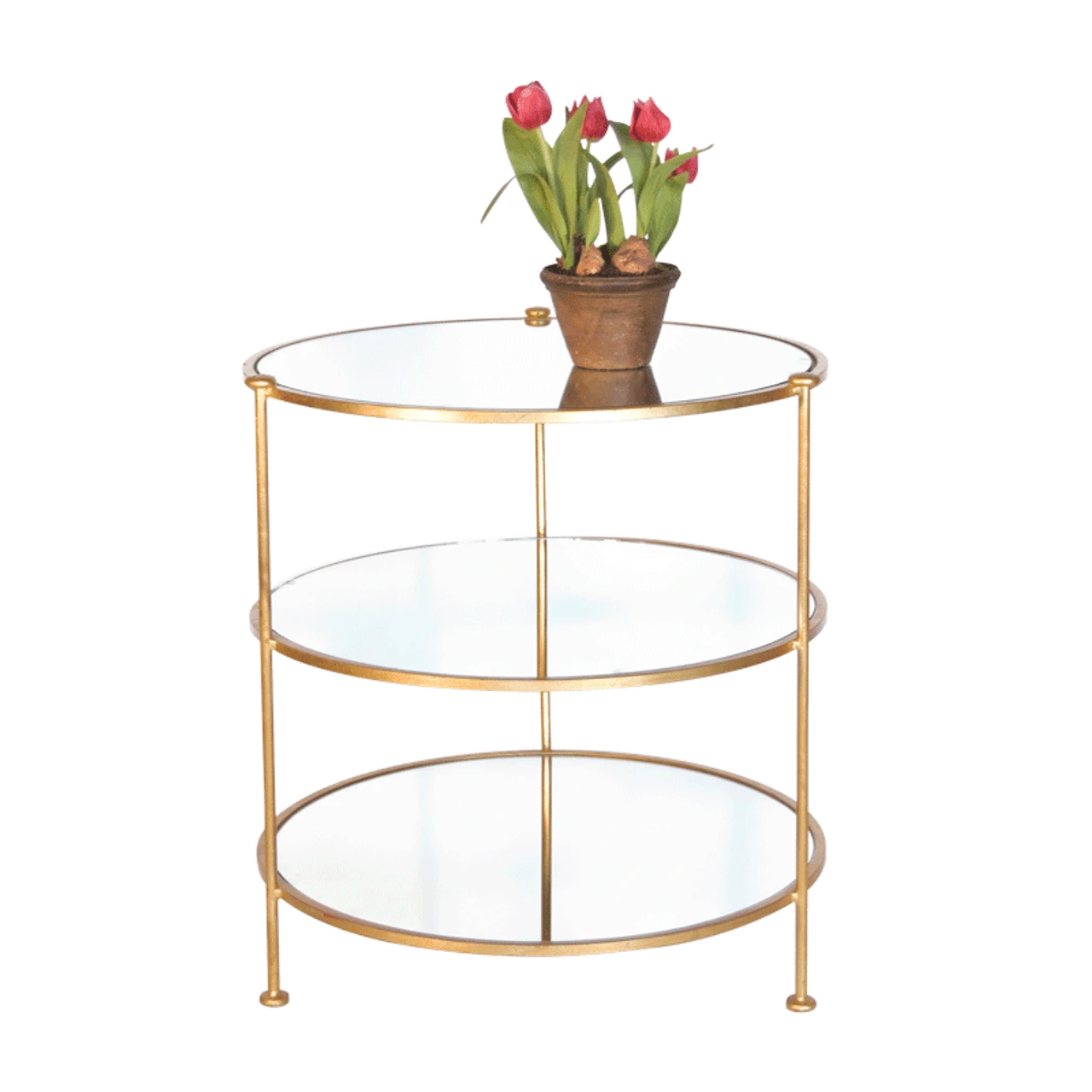 Enjoy the 3-Tier Gold Lf Table W Mir Shelves in your home today! Make over your favorite nook with our fabulous three-tier, round side table. Brilliant gold leaf finish adds luster to its hand-forged iron frame. Generously scaled mirrored top and shelves. Place your lamp and framed photos on top, plus your favorite books and accessories on the shelves below.