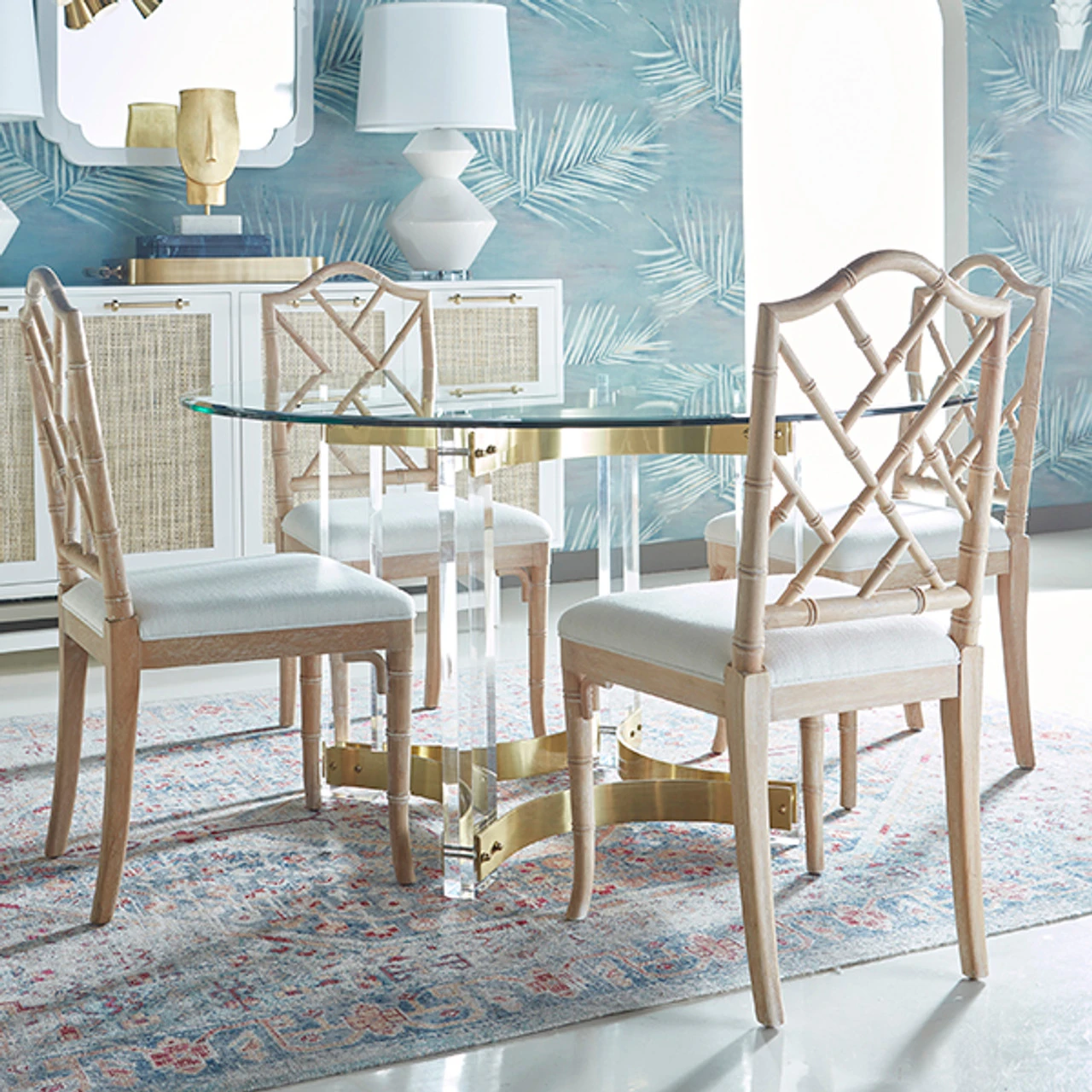 Enjoy the Acrylic Dining Table Base – Antique Brass Stretchers And 54″ Dia Glass in your home today! The joyous curvature of our Hendrix table base will have you sending out the invites for dinner parties every weekend! Rigid acrylic legs are joined by arching, antique brass stretchers to create a look that is both light and luminous. Perfectly complemented with a 54″ diameter, beveled glass top. Brilliant! Seats 4-6 guests comfortably.