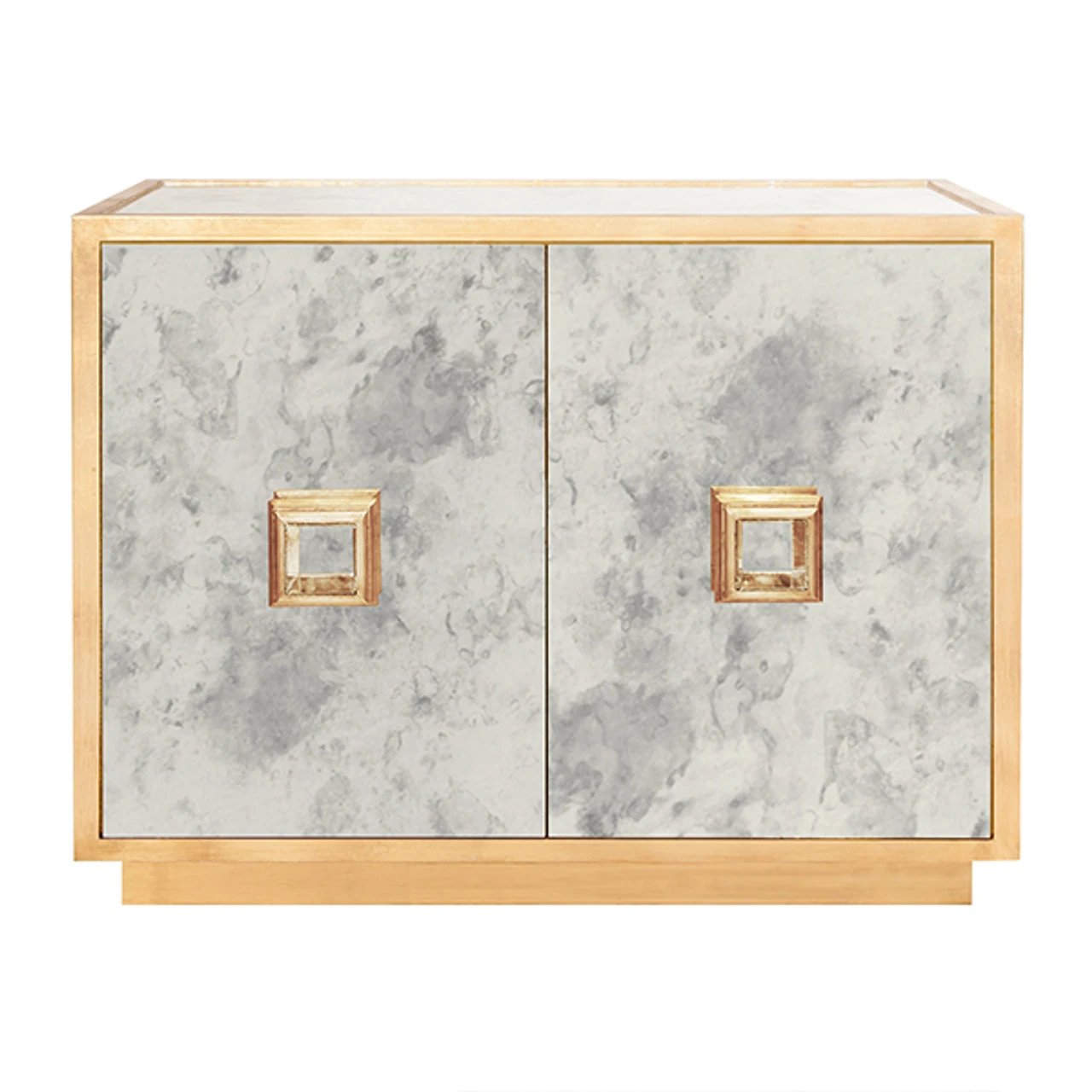 Enjoy the Ant Mirror 2 Door Cabinet – Gold Leaf Detailing in your home today! Looking to amp up your style with megawatt glamour? Our Winslow two door cabinet is an extraordinary pairing of one-of-a-kind antique mirror overlaid with hand-applied, gold leaf overlay and border. Greek key base detail and gold square hardware elevate this show piece to five star status. Includes fixed interior shelf.