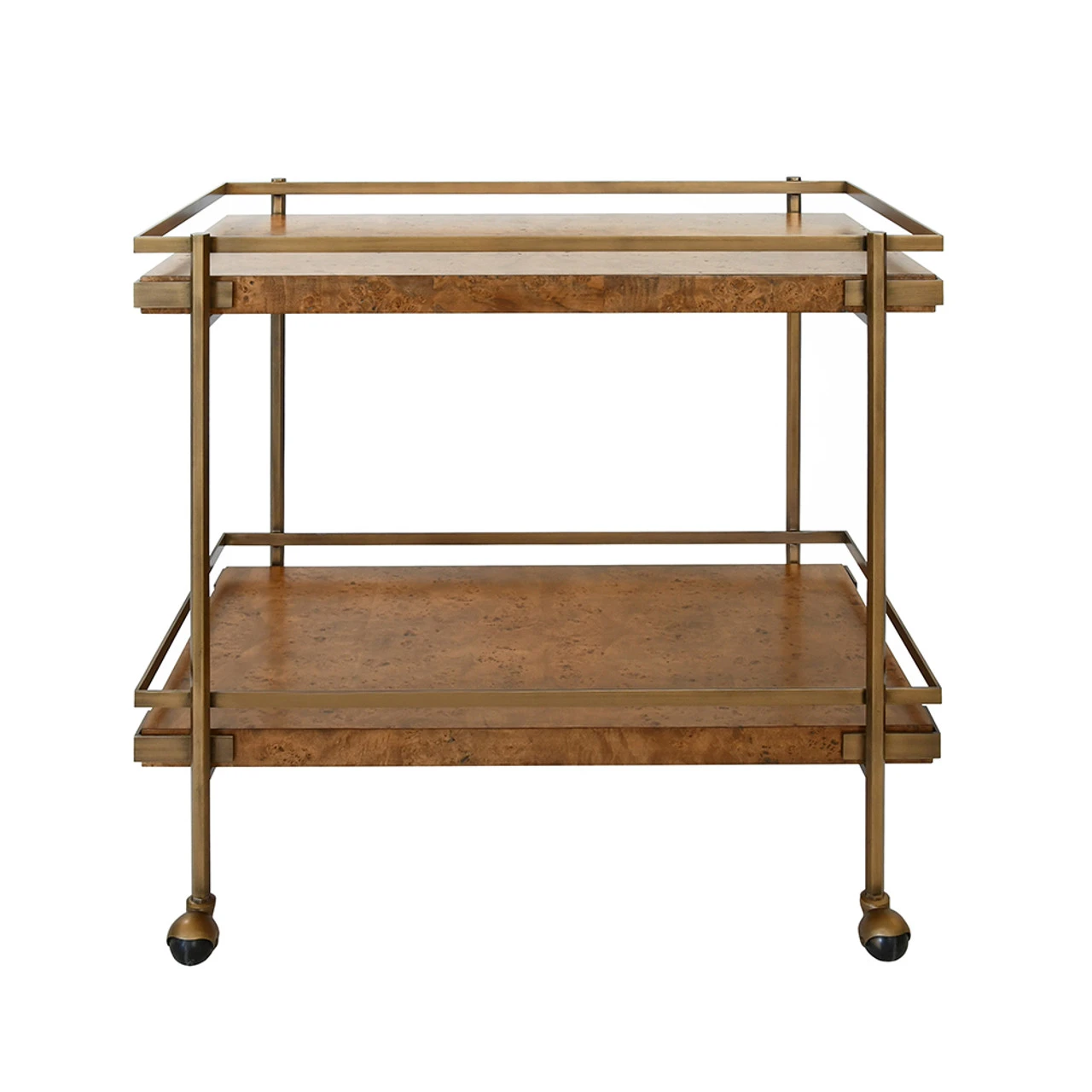 Enjoy the Antique Brass Bar Cart – Shelves – Dark Burl Wood in your home today!