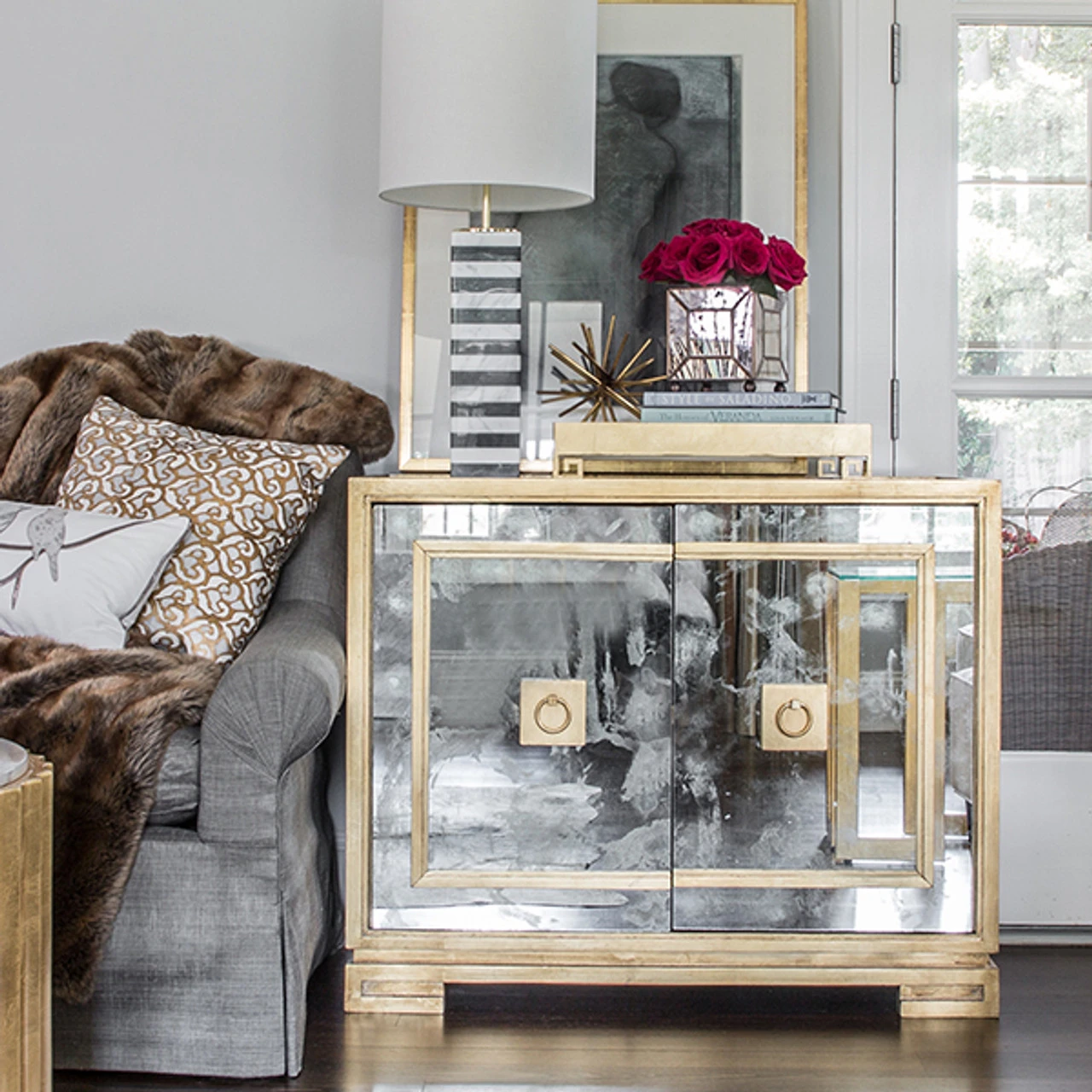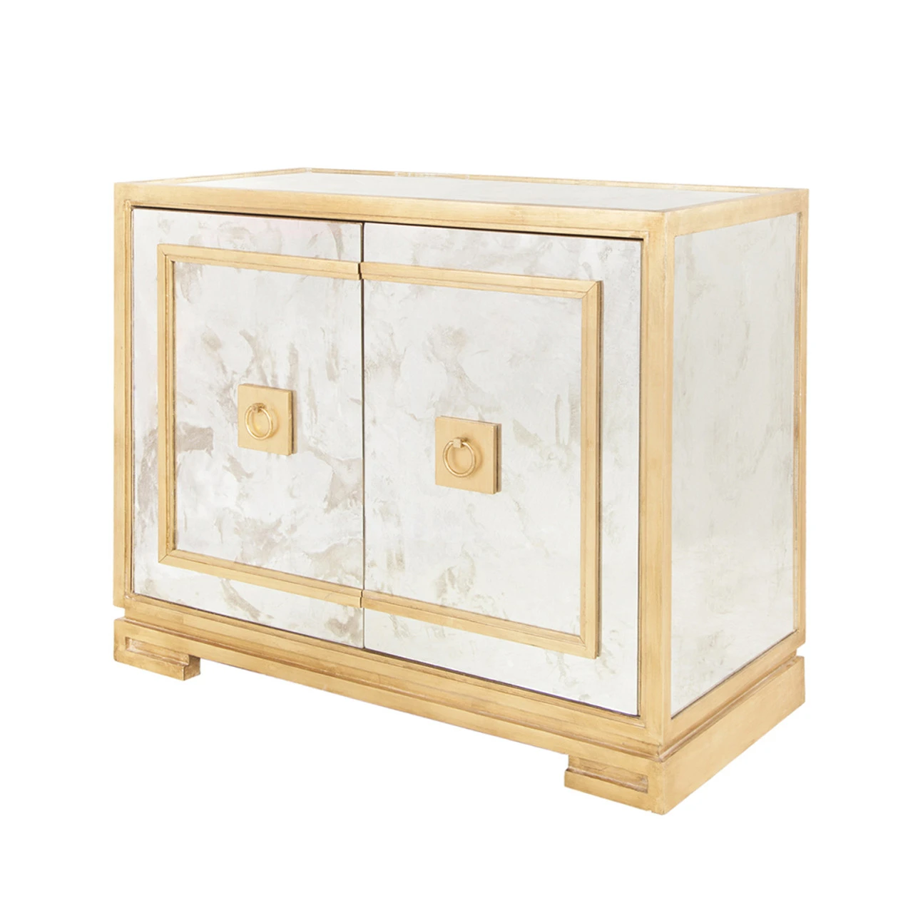 Enjoy the Antq. Mirror & Gl 2 Door Cabinet W Greek Key Detail in your home today! Looking to amp up your style with megawatt glamour? Our Ophelia two-door cabinet is an extraordinary pairing of one-of-a-kind antique mirror overlaid with hand-applied, gold leaf overlay and border. Greek key base detail and gold ring hardware elevate this show piece to five star status.