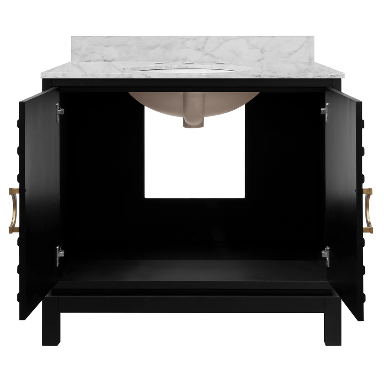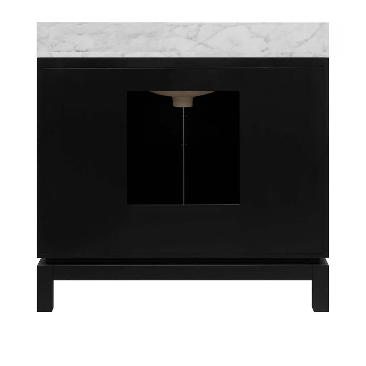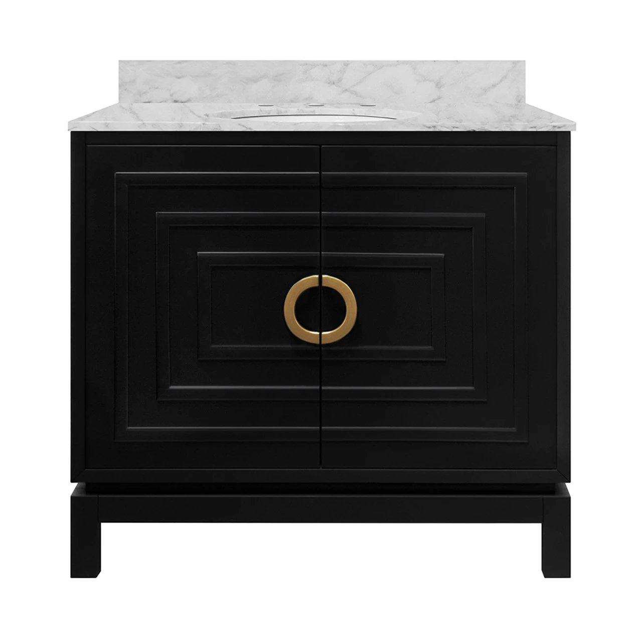 Enjoy the Bath Vanity – Matte Black Lacquer – Antique Brass Circle Hardware, White Marble Top, And Porcelain Sink in your home today!