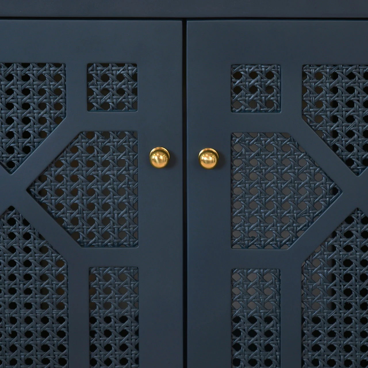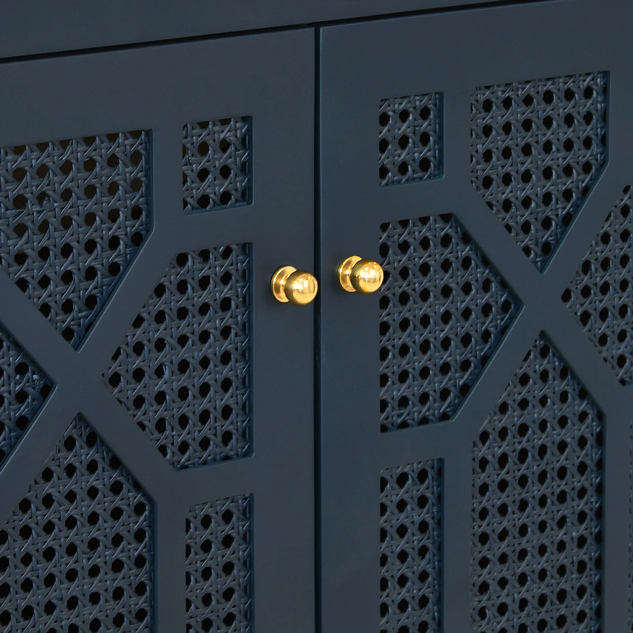 Enjoy the Bath Vanity – Matte Navy Lacquer – Cane Front Doors, White Marble Top, Porcelain Sink, And Polished Brass Knobs in your home today!