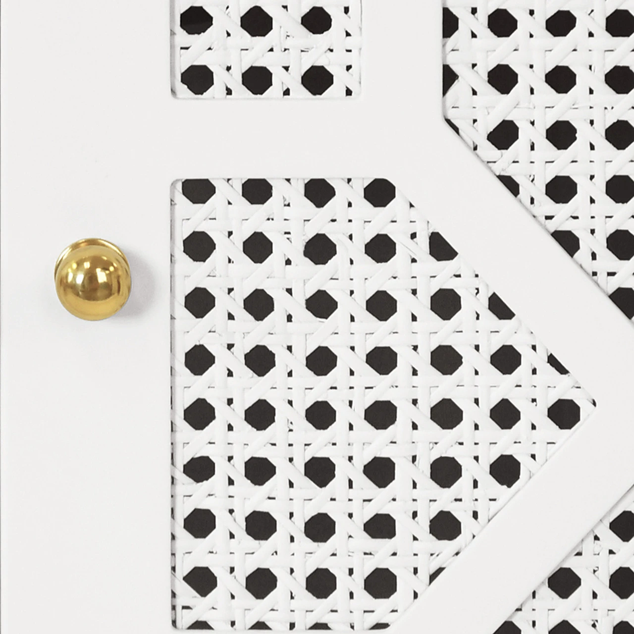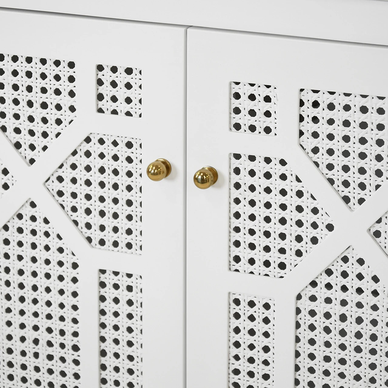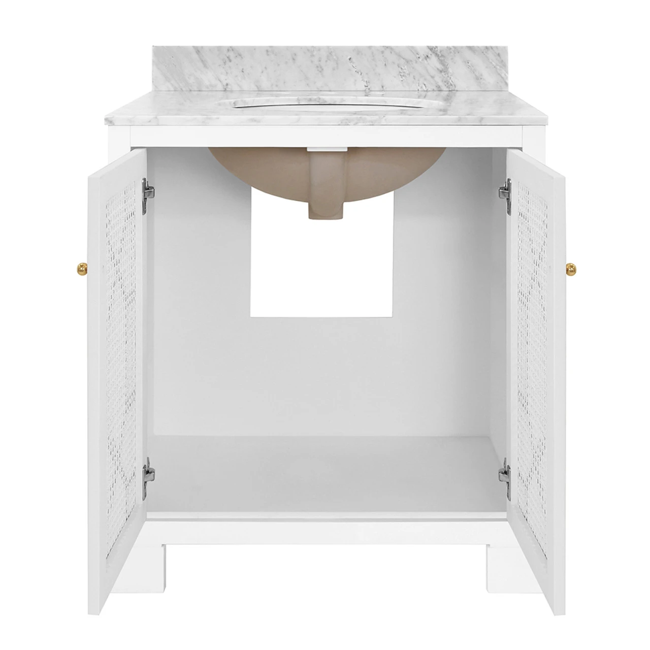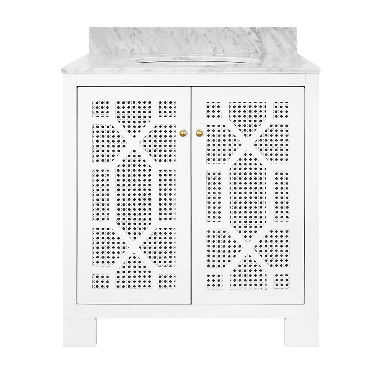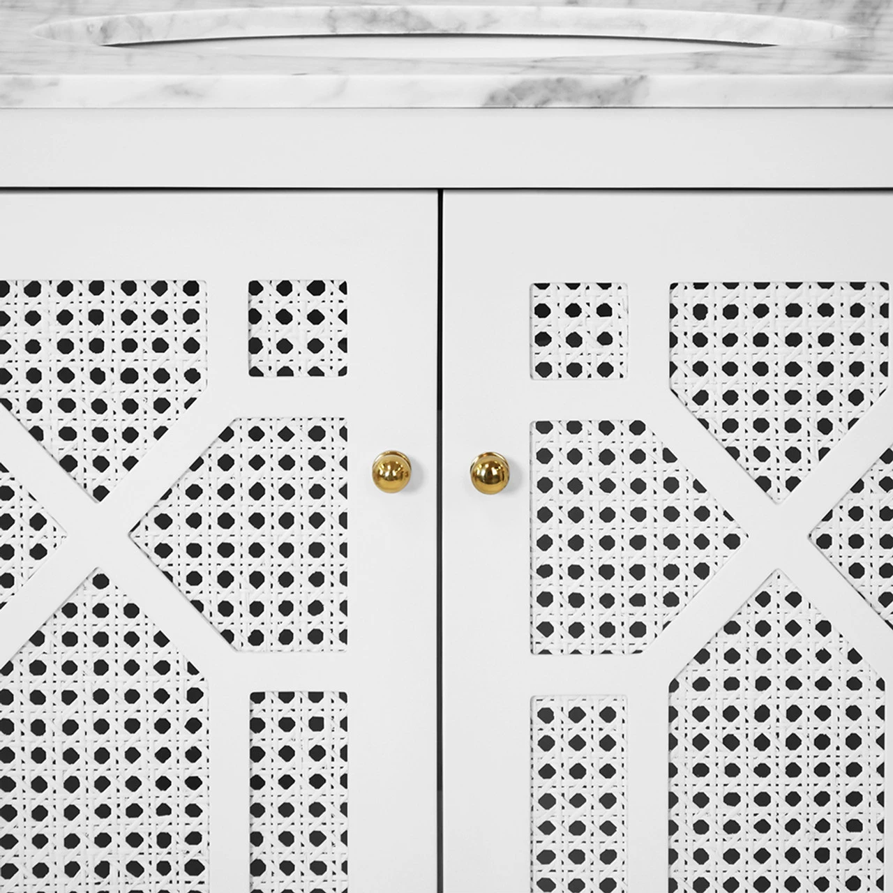 Enjoy the Bath Vanity – Matte White Lacquer – Cane Front Doors, White Marble Top, Porcelain Sink, And Polished Brass Knobs in your home today!