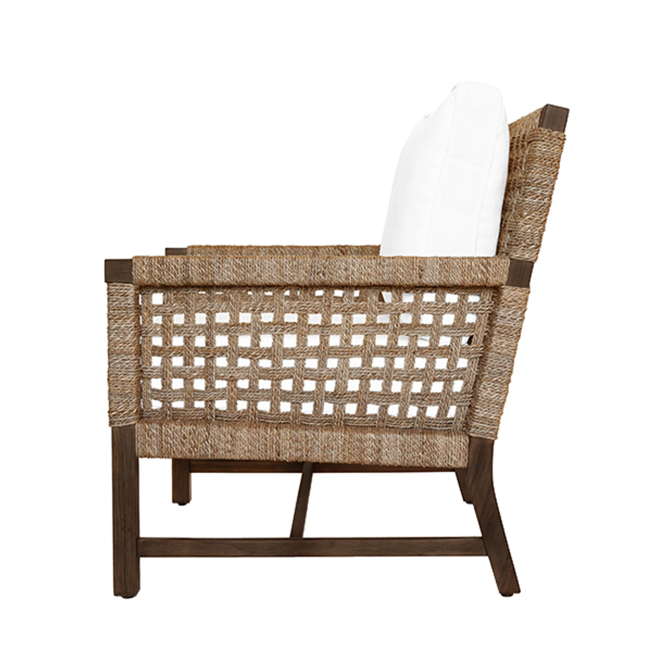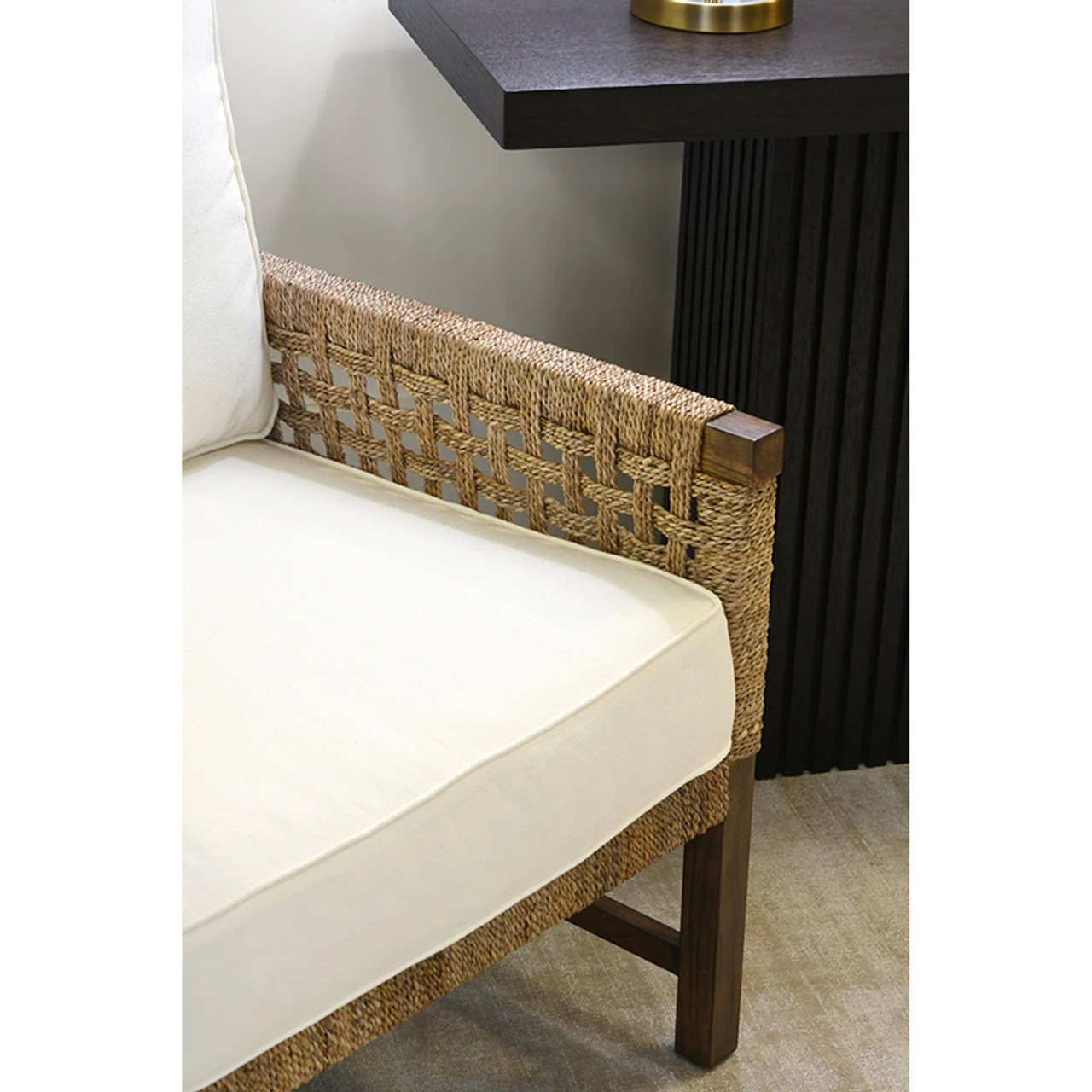 Enjoy the Club Chair – Woven Seagrass Detail And Ivory Linen Cushion in your home today! The Harmon club chair is destined to become your personal sanctuary. Its natural materials, from the mindi wood frame to the woven seagrass details and the sumptuous ivory linen cushion, come together to form a symphony of textures and fibers that evoke a sense of serenity and refinement. The removable feature of the stain resistant ivory linen cushions adds both practicality and versatility, allowing you to easily clean and maintain their pristine appearance. Sit back, relax, and soak in the comfort of the Harmon club chair.