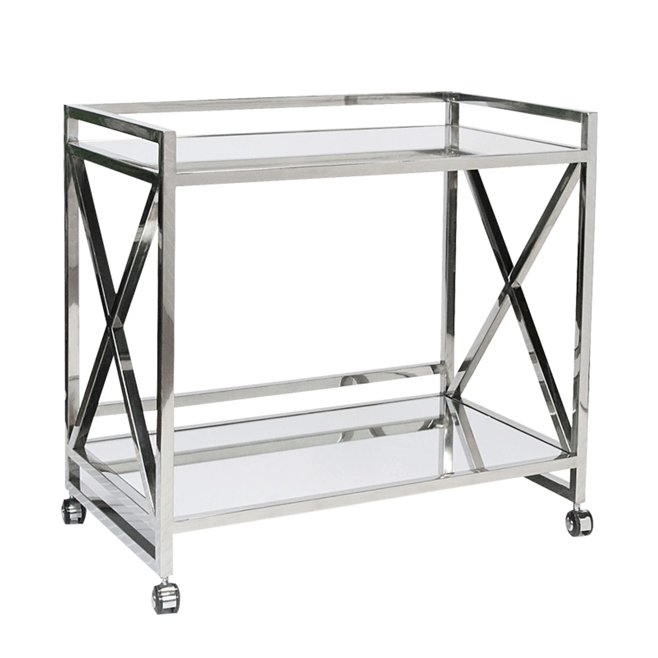 Enjoy the Gerard Polished Stainless “X” Bar Cart With Mirrored Tops in your home today!