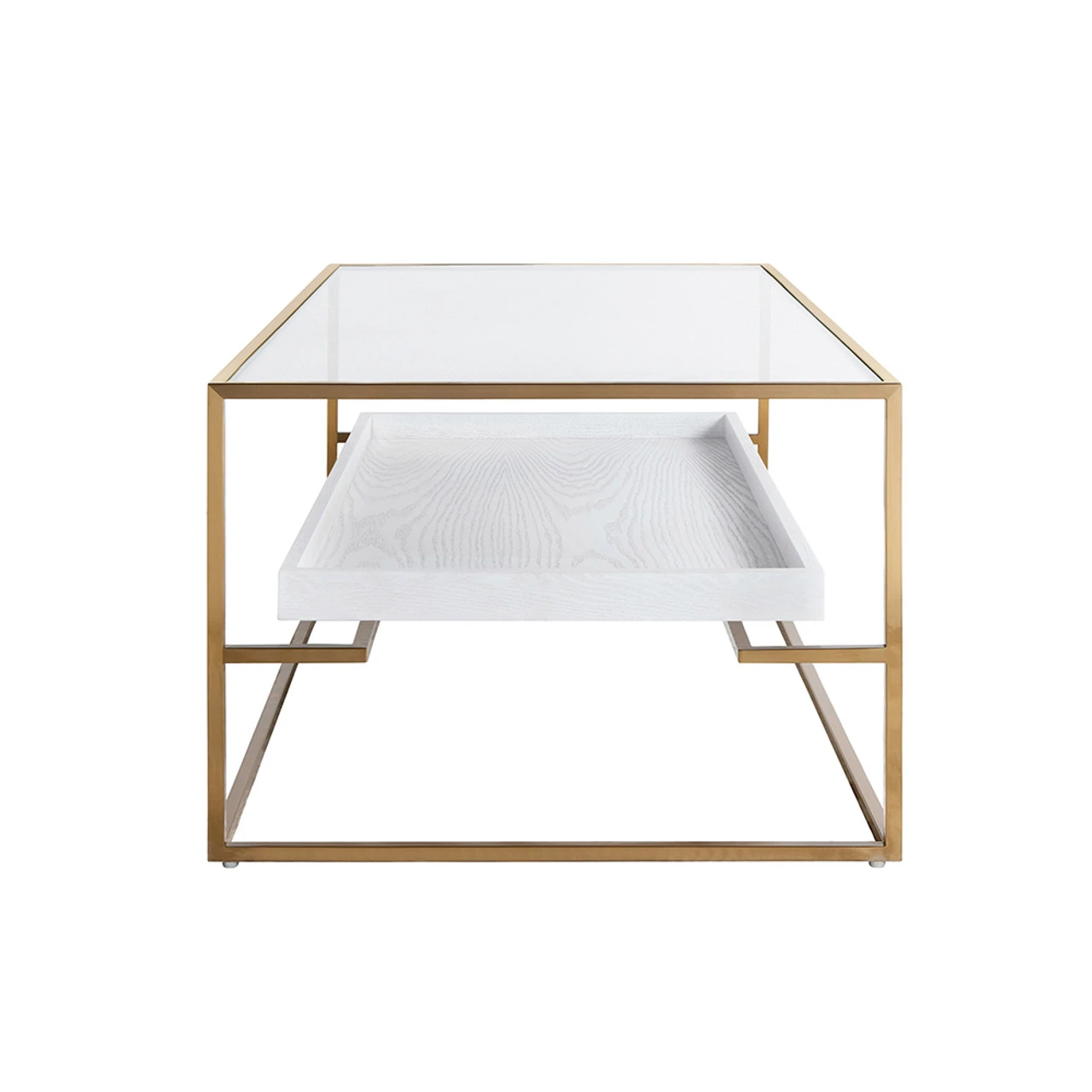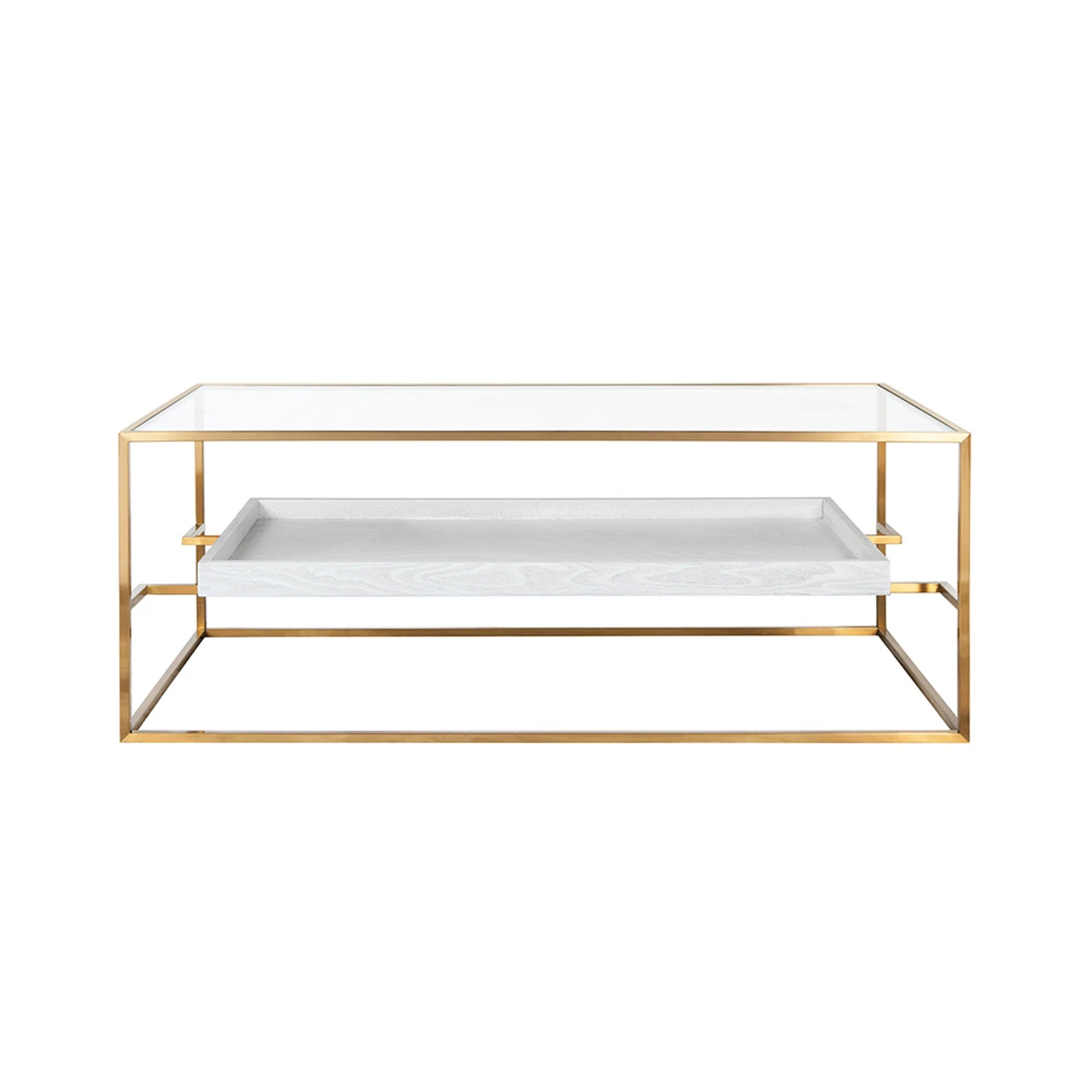 Enjoy the Glass Top Antique Brass Coffee Table – Floating Shelf – White Washed Oak in your home today!