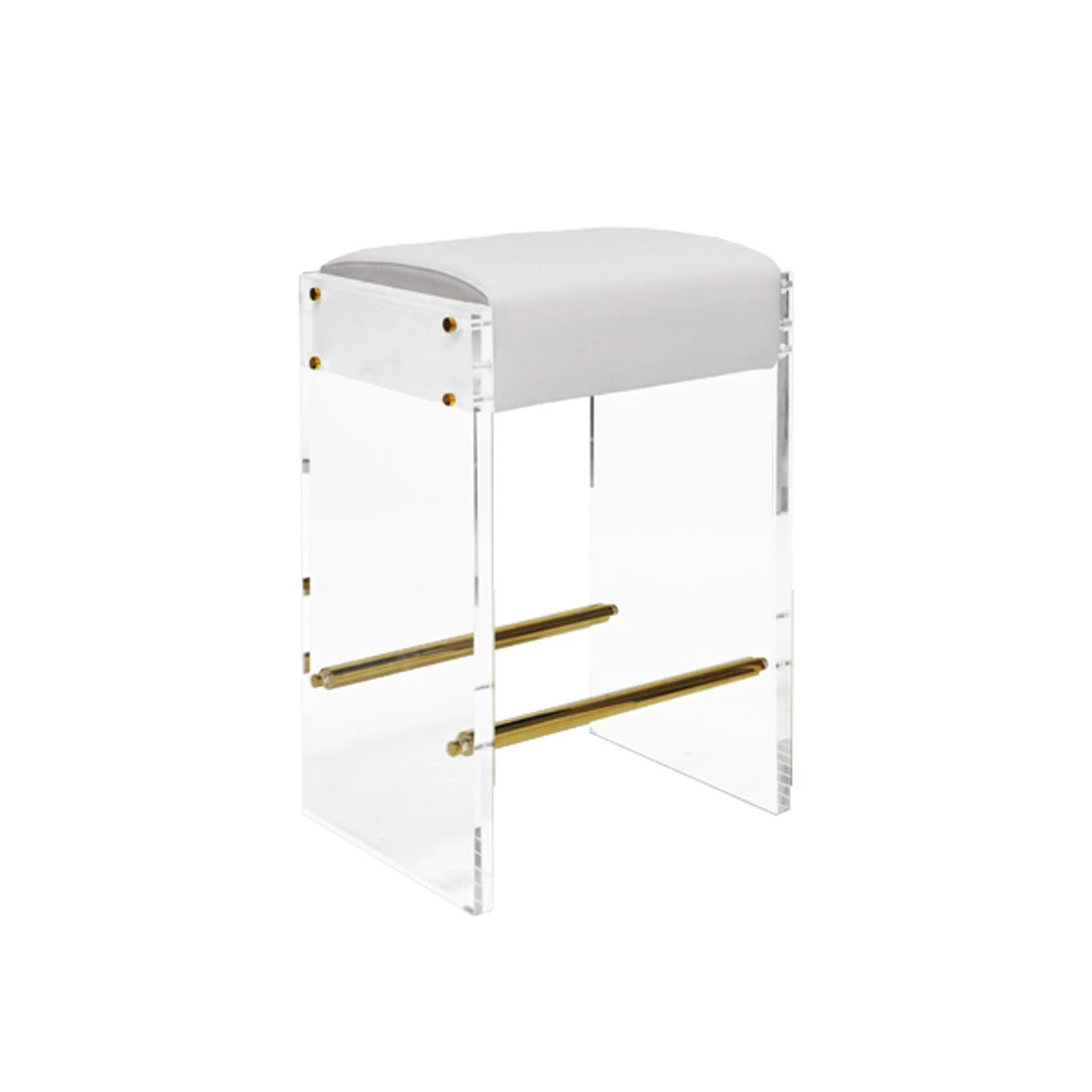 Enjoy the Acrylic Panel Count. Stool W. Wh Vinyl Cush.& Brass Hrdwr in your home today! You’ll love the illusion of weightlessness and luxury with our Indy counter stool. Sturdy and glamorous, the Indy features a pristine, white vinyl cushion secured between acrylic side panels and polished brass hardware accents.