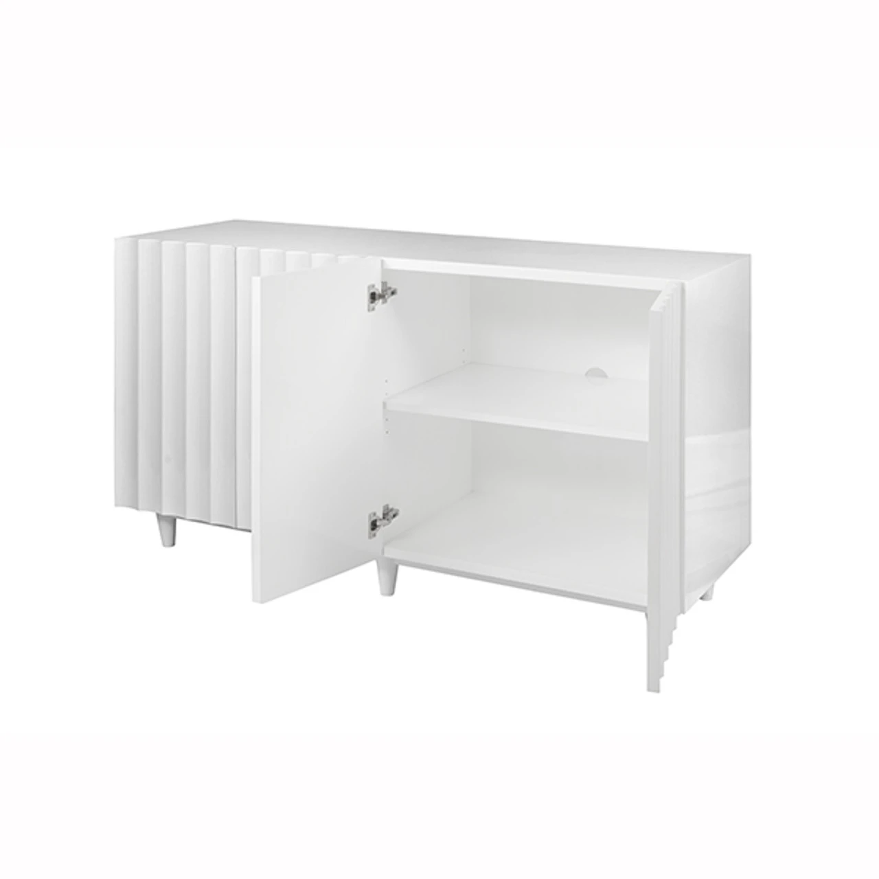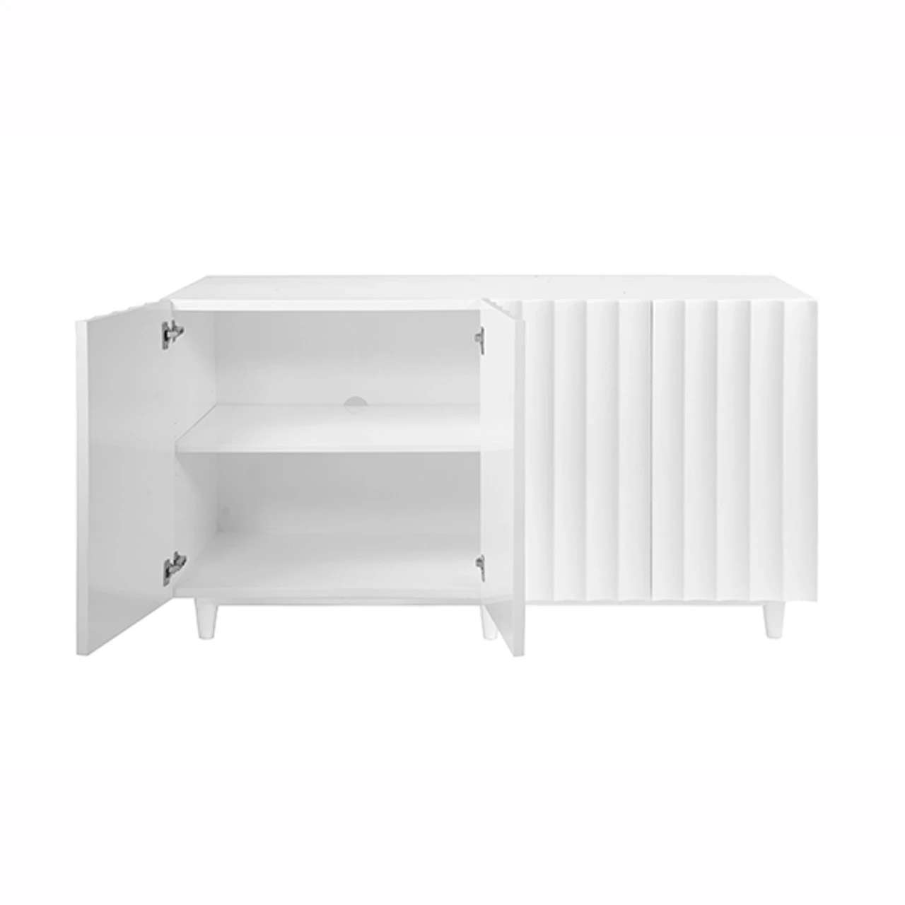 Enjoy the White Lacq 4 Dr Scalloped Front Cabinet in your home today! Express your inner minimalist with our sublime, statement-making Odette cabinet. A unique scalloped design conceals four doors which open to reveal ample storage. Both cabinets include adjustable/removeable shelf and cut-out for media wire management. Finished in our signature glossy white lacquer with elegant tapered legs.