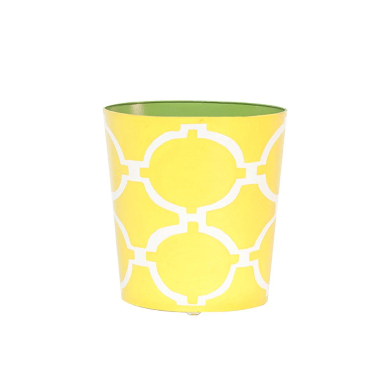 Enjoy the Oval Wastebasket Yellow/Cream in your home today! Unexpected details bring surprise and delight to your space and offer a professional finishing touch. This elegant oval wastebasket features a modern handpainted cream geometric design on a yellow base with a pop of green color to accent the interior.