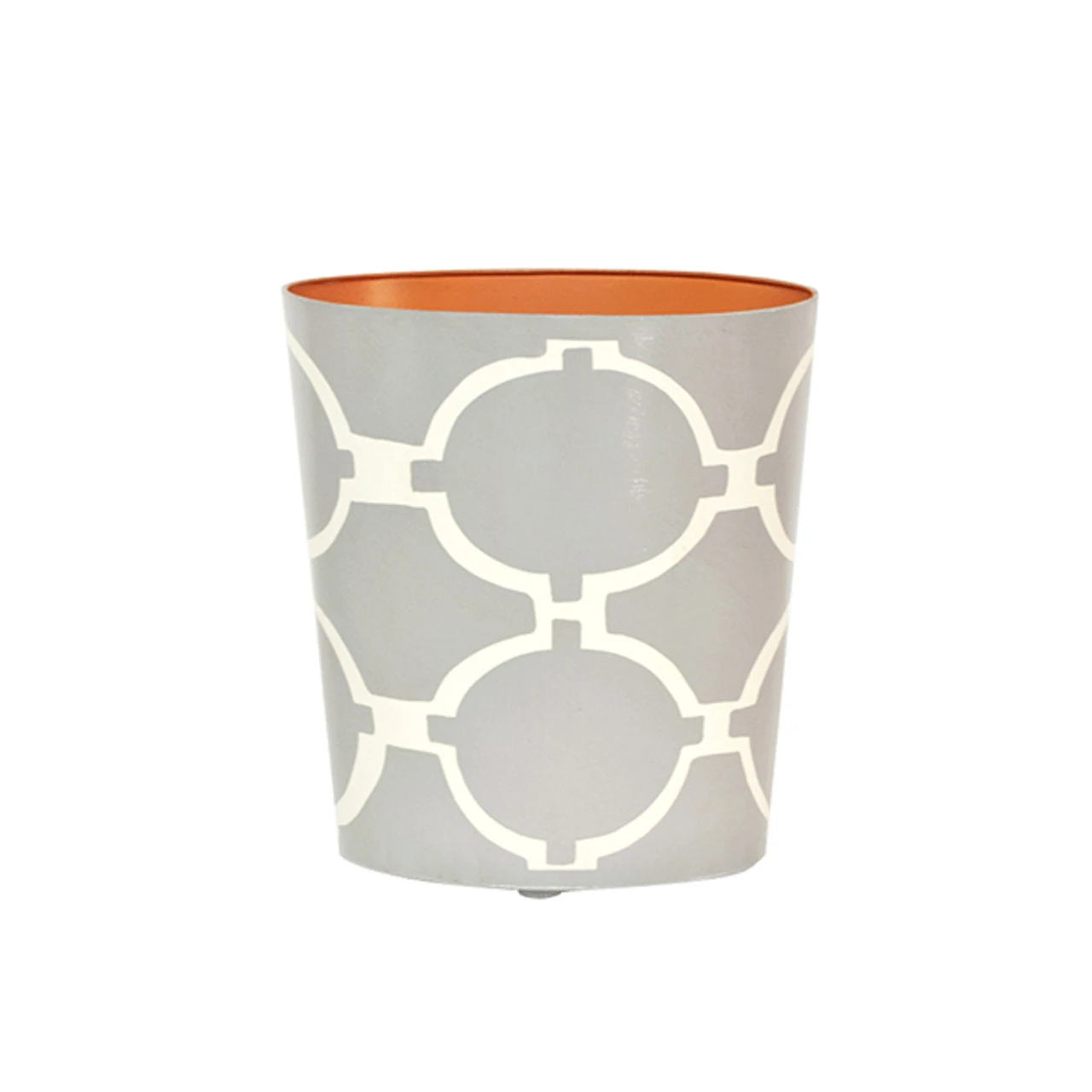 Enjoy the Oval Wastebasket Grey/Cream in your home today! Unexpected details bring surprise and delight to your space and offer a professional finishing touch. This elegant oval wastebasket features a modern handpainted cream geometric design on a grey base with a pop of orange color to accent the interior.