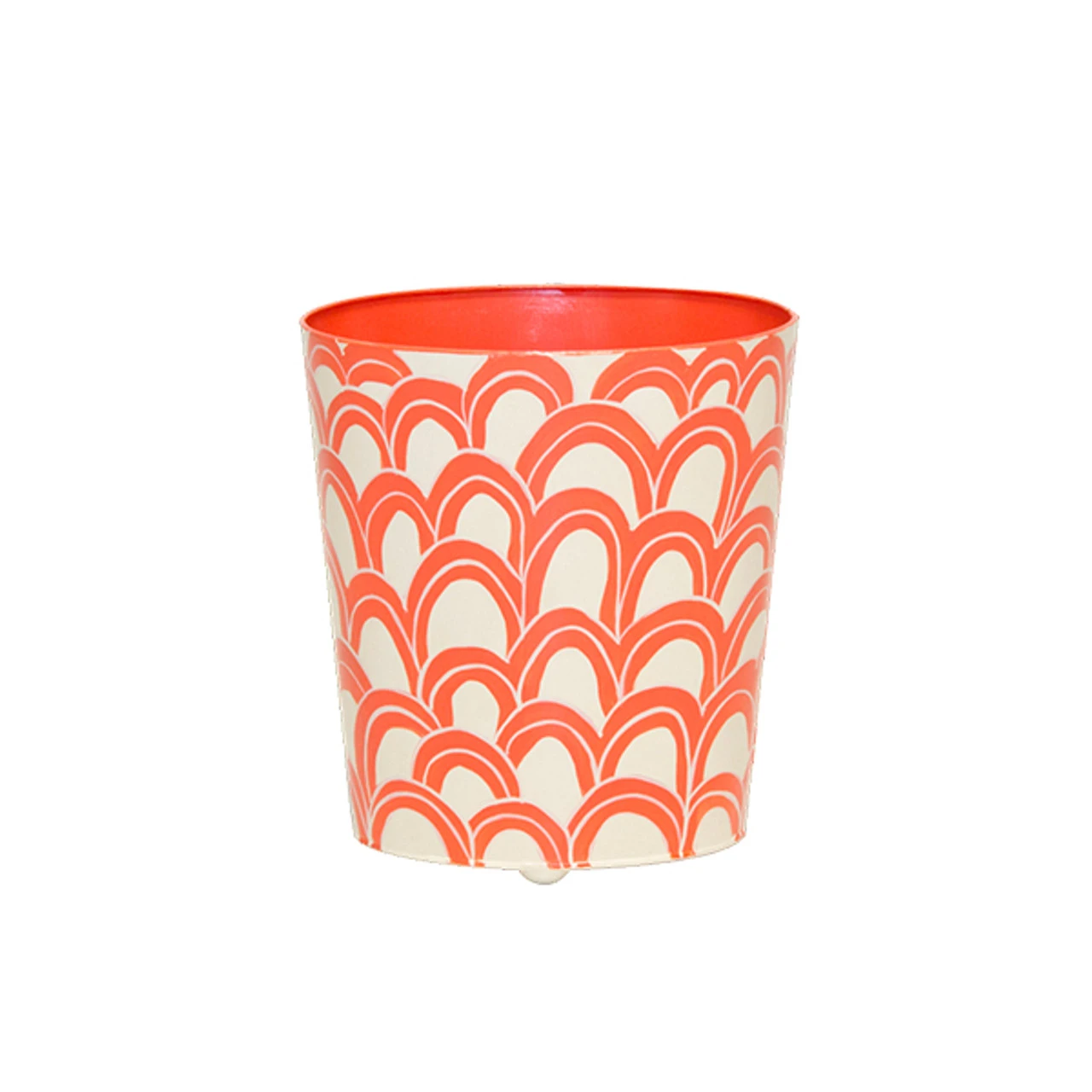 Enjoy the Oval Wastebasket Orange And Cream in your home today! Unexpected details bring surprise and delight to your space and offer a professional finishing touch. This elegant oval wastebasket features a navy painted scallop design on a cream base with a pop of orange color on the interior.