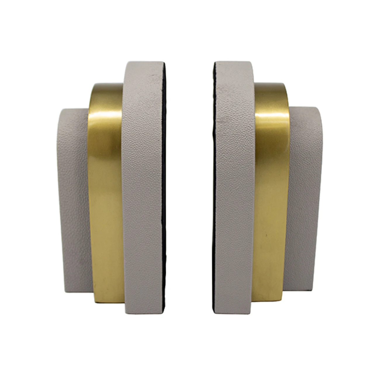 Enjoy the Pair Of Antique Brass And Grey Shagreen Bookends in your home today! With alternating dove grey shagreen and antique brass finishes, our Hart bookends are treasures you’ll keep for generations to come, no matter the change in trends.