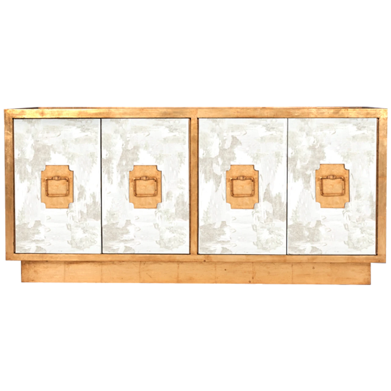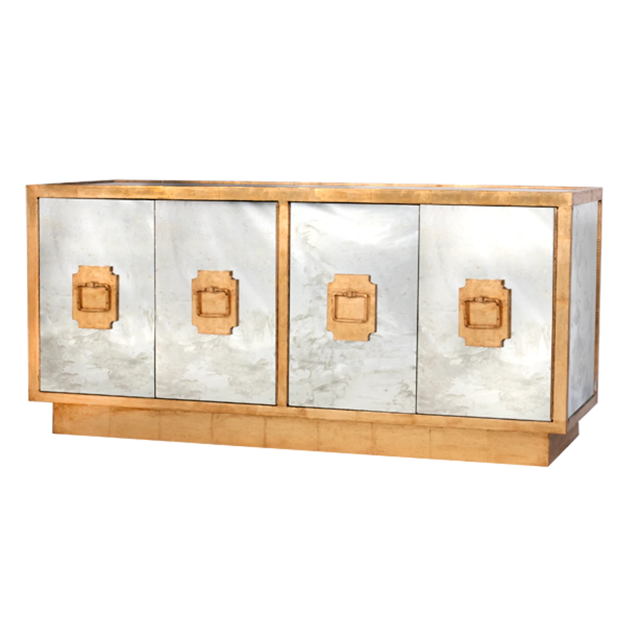 Enjoy the Entertainment Console Ant Mir Gold Lf in your home today! Looking to amp up your style with megawatt glamour? Our Ponti four-door console is an extraordinary pairing of one-of-a-kind antique mirror overlaid with hand-applied, gold leaf overlay and border. Greek key base detail and gold square hardware elevate this show piece to five star status. Fixed interior shelves and cut-outs for media wire management in each cabinet.