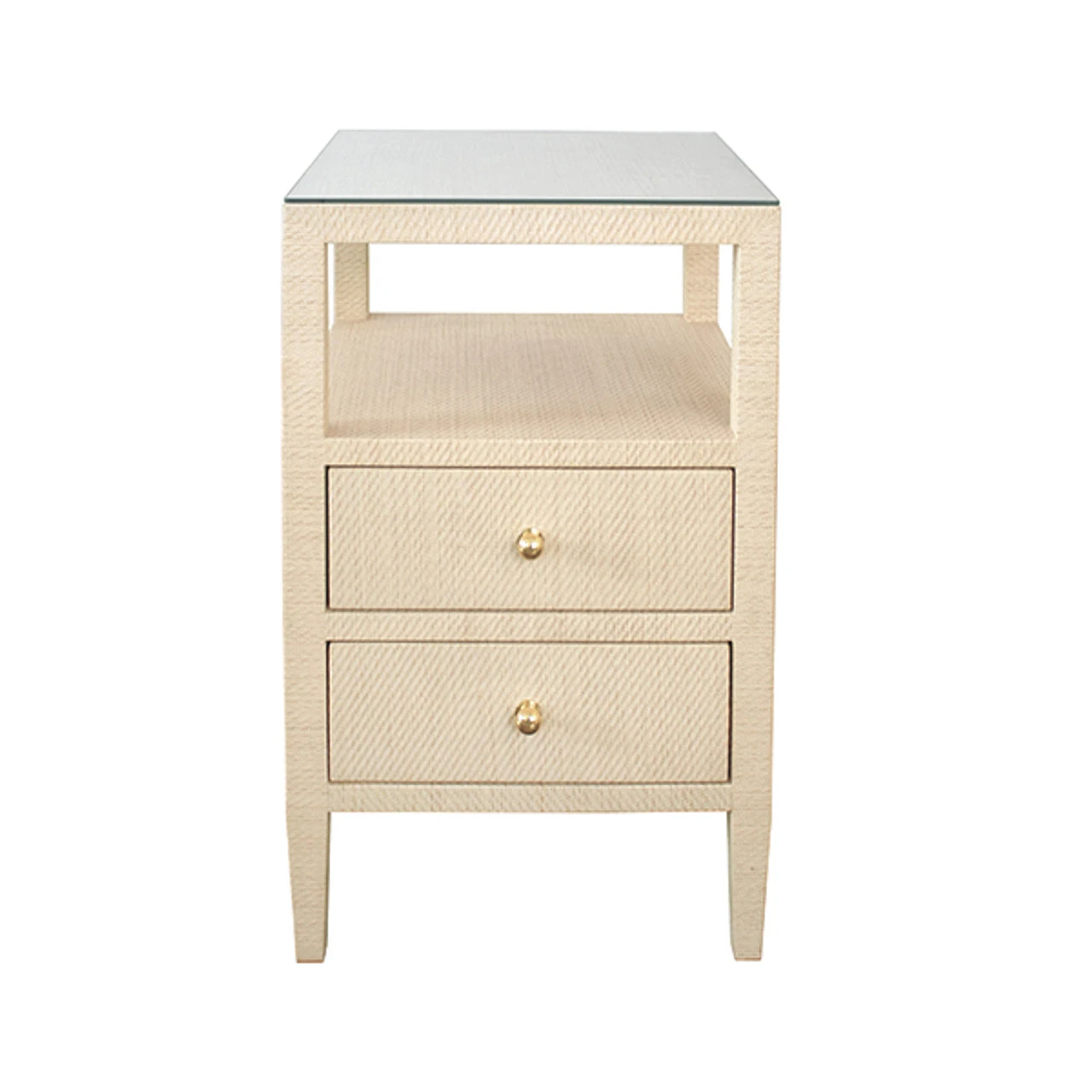Enjoy the Two Drawer Side Table – Natural Grasscloth in your home today! With its sophisticated form and subdued texture, the Roscoe side table brings style and elegance to any room. Two drawers with petite brass pulls sit elegantly beneath an open storage shelf. Finished in natural grasscloth, its the perfect accompaniment to your favorite chair.