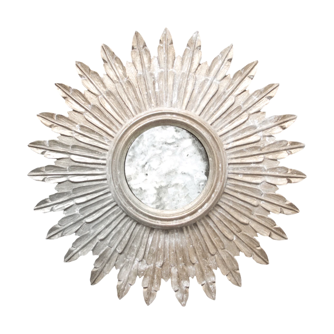 Enjoy the Champagne Slvr Lf Handcarved Mir in your home today! The delicate radial pluming of our hand-carved Santo mirror is inspired by an archer’s arrow. Hand finished in exquisite champagne silver leaf with an antique mirror inset.