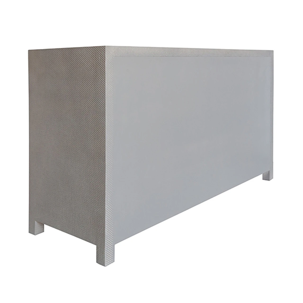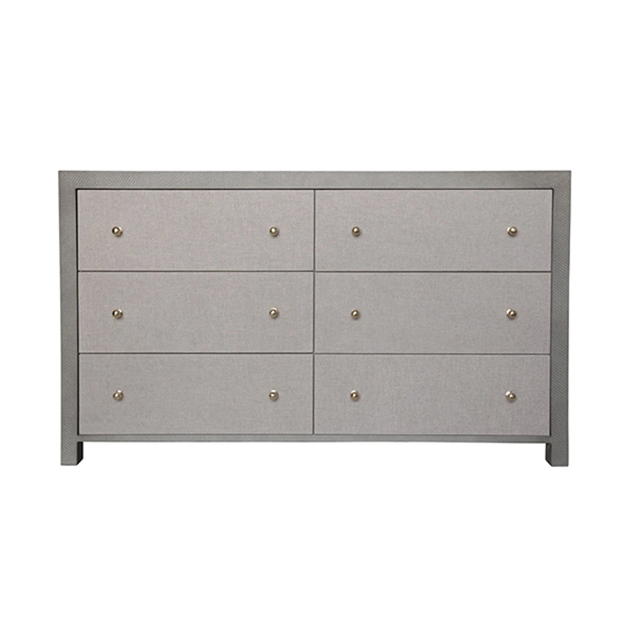 Enjoy the Six Drawer Chest – Grey Grasscloth – Grey Linen Drawers And Brass Hardware in your home today! With its sophisticated yet subdued combination of textures, the Lowery six drawer chest delivers style and grace to any room. Grey linen drawers with petite brass pulls sit elegantly within a coordinating grey grasscloth frame.