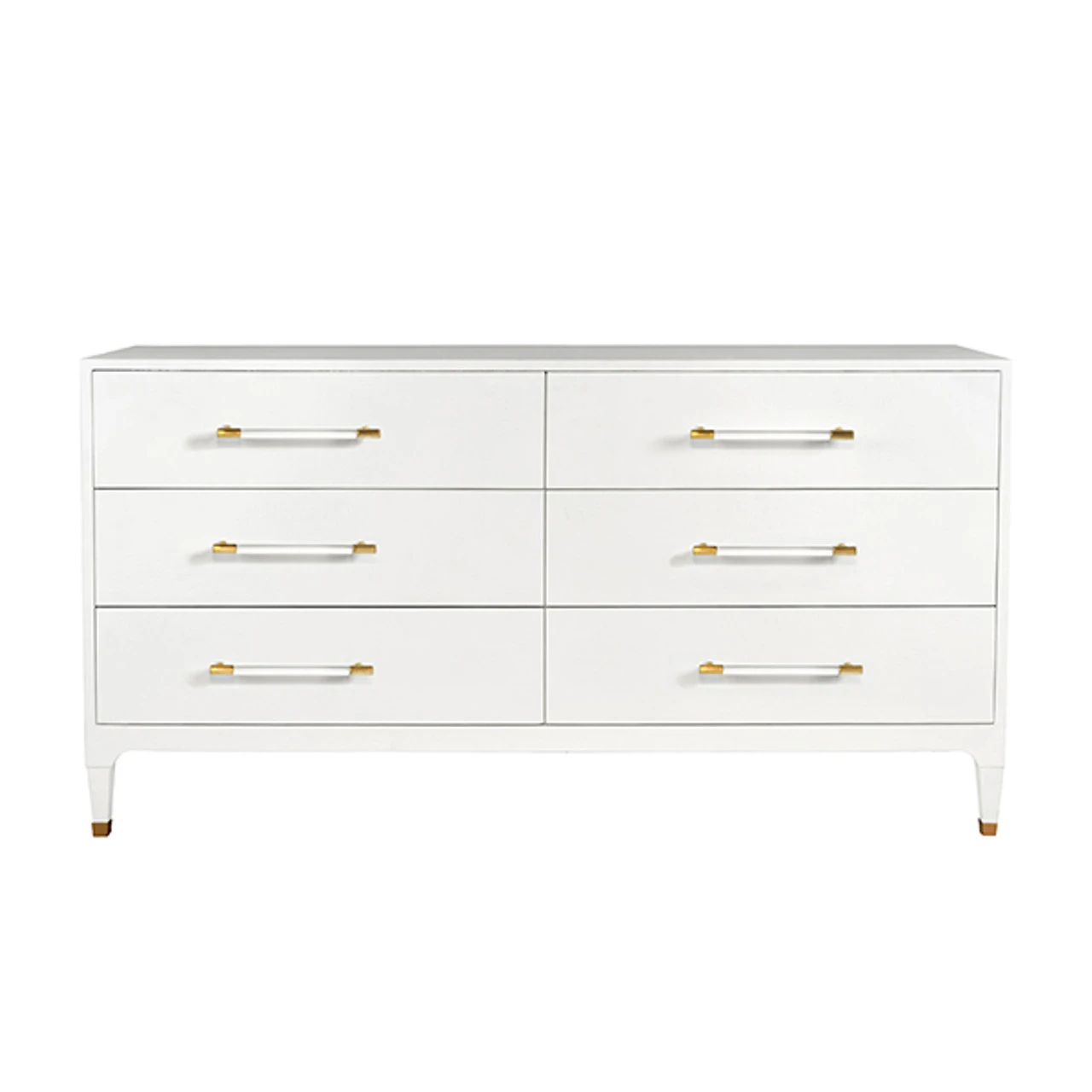 Enjoy the Six Drawer Chest – Textured White Linen – Antique Brass And Acrylic Hardware in your home today! Coco Chanel once said “simplicity is the keynote of all true elegance,” and we couldn’t find a truer statement to describe our six drawer Maren chest. Dressed in textured white linen and accented with acrylic and antique brass hardware pulls. Antique brass ferrule foot caps complete the elegant look.