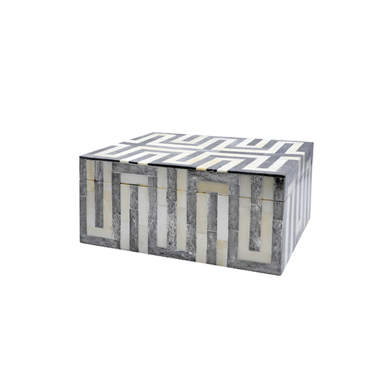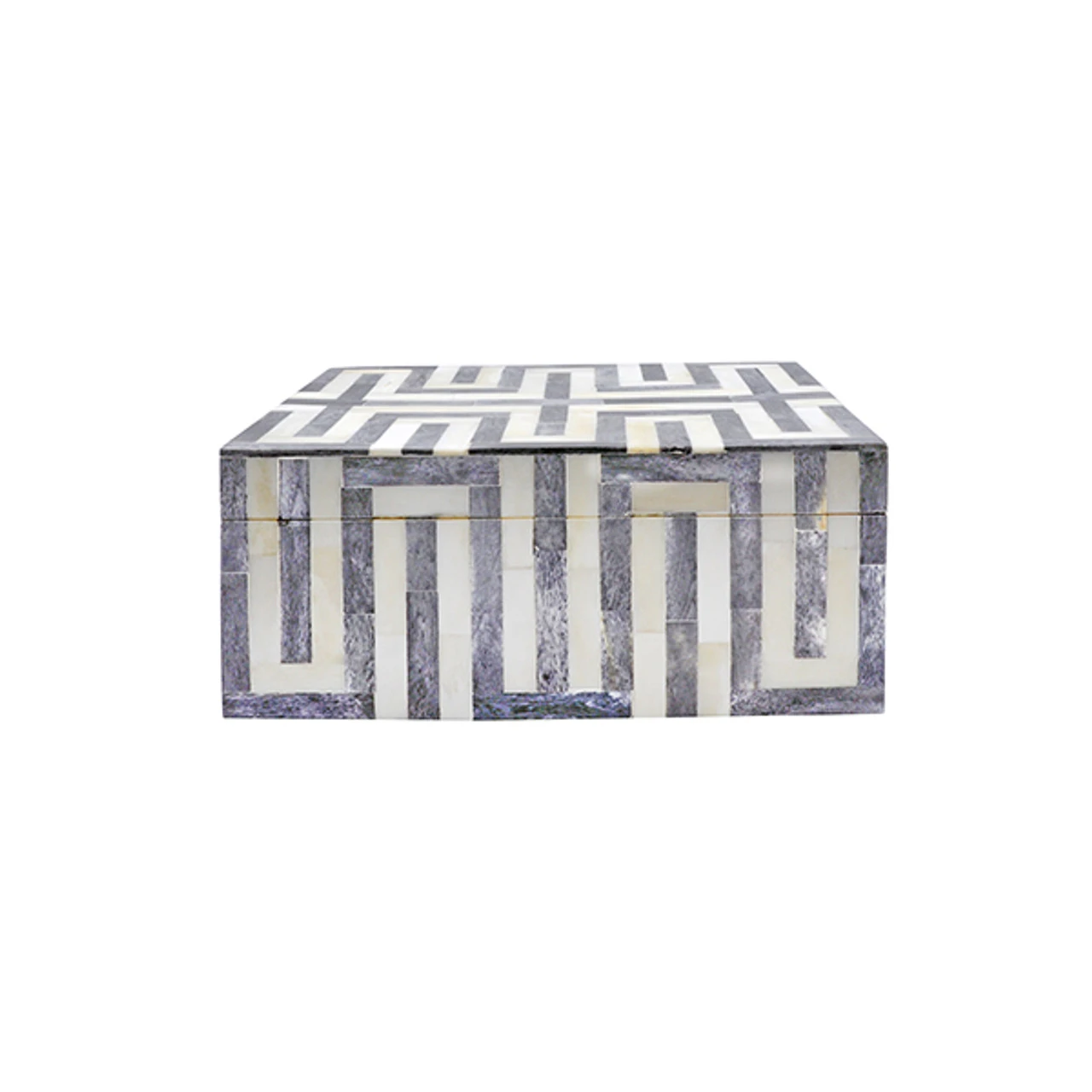Enjoy the Small Geometric Patterned Box – Dark Grey And White Resin in your home today! Alternating charcoal grey and cream colored bone tiles create a bold, graphic pattern on our Mellie box guaranteed to dress up any shelf in a hurry!