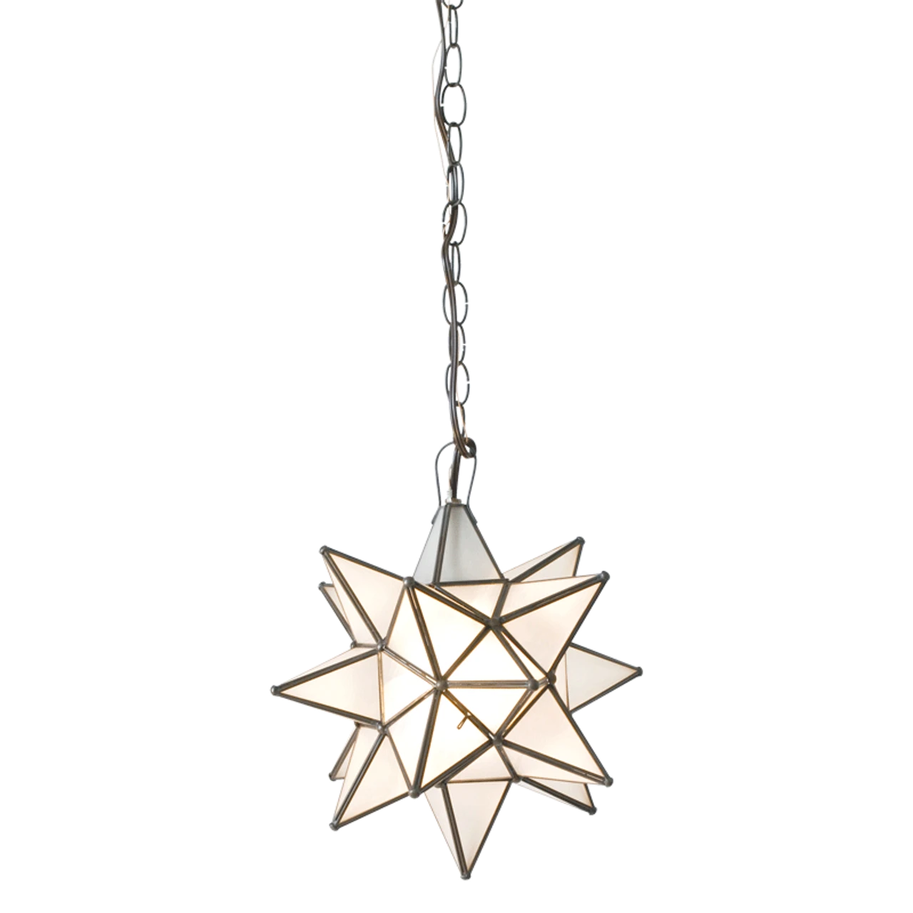Enjoy the Sm Frosted Star Chandelier in your home today! Whether you install one or group several together, our small 12″ diameter frosted star chandelier brings beautiful sparkle to your decor throughout the day and night. Each star comes standard with 3′ of antique brass chain and canopy. Additional chain length available for purchase to accommodate your custom installation.
