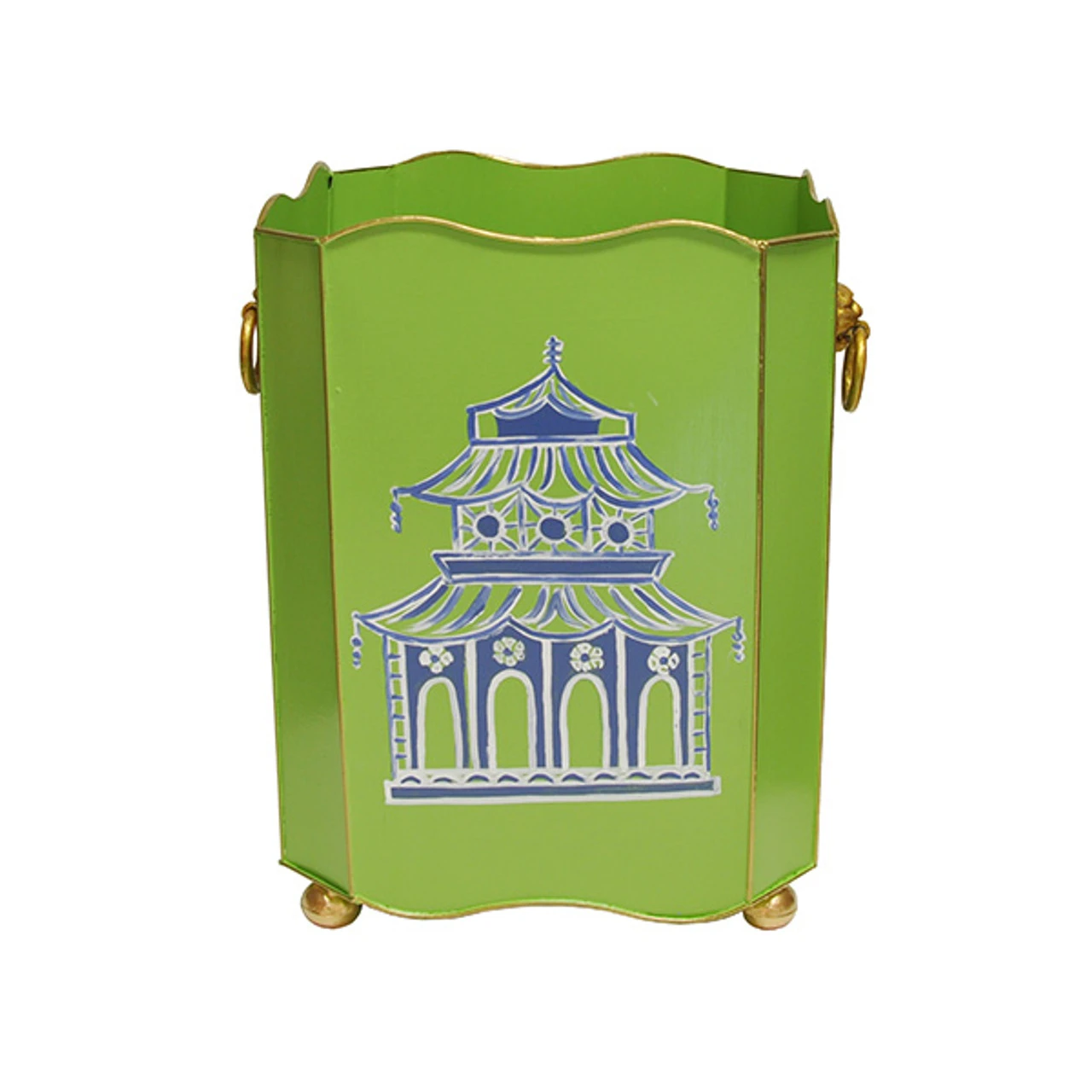 Enjoy the Square Wastebasket – Lion Handles – Green Pagoda in your home today! Unexpected details bring surprise and delight to your space and offer a professional finishing touch. This elegant square wastebasket with raised ends, a delicate scalloped edge, and gold lion handles features a painted blue and white pagoda on a green base with gold edge detailing and gold ball feet.