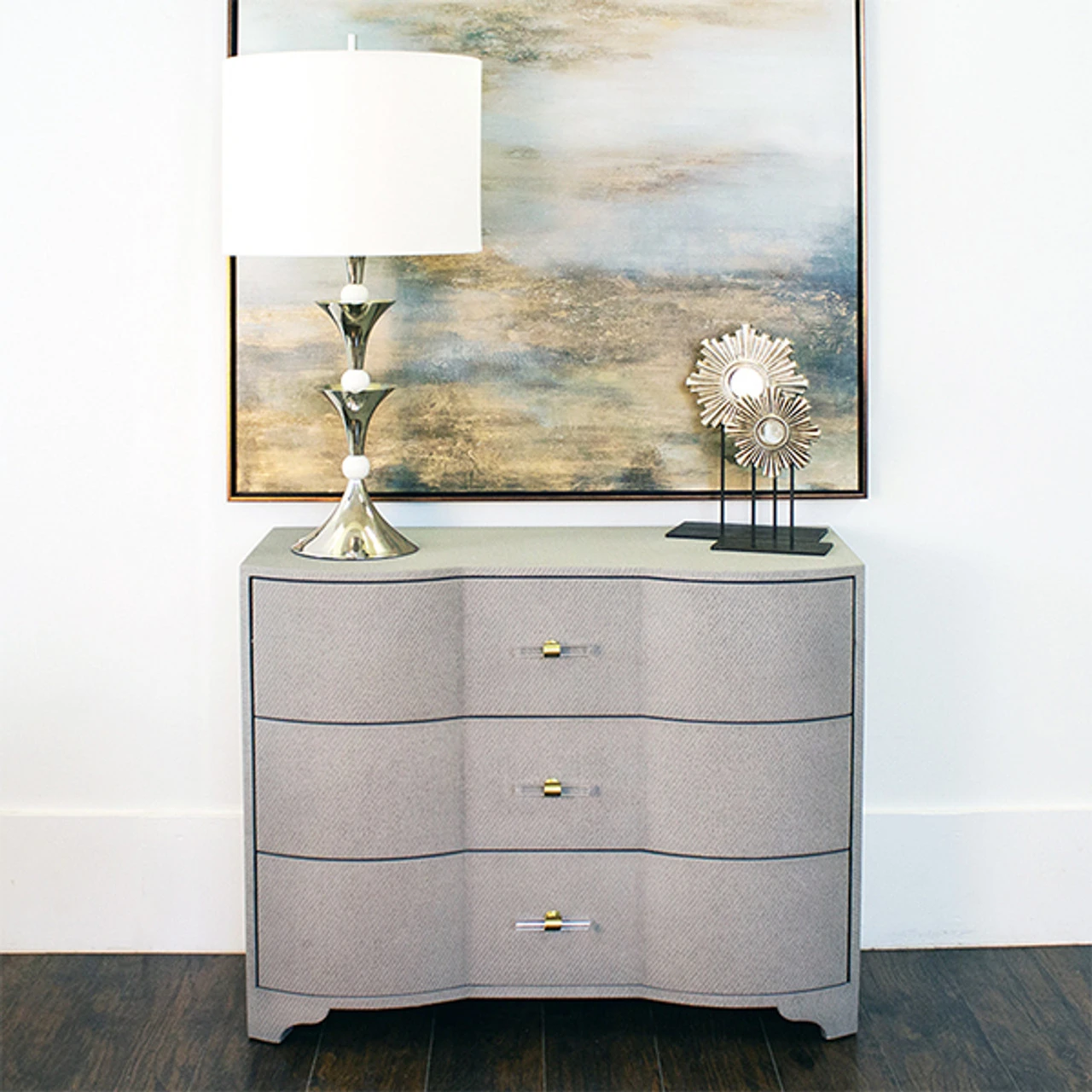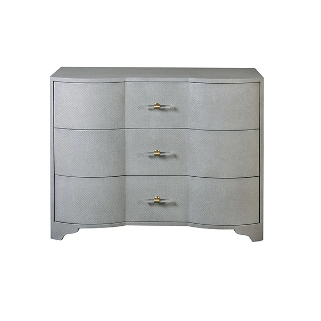 Enjoy the Three Drawer Chest – Grey Grasscloth in your home today! Our stunning Plymouth three drawer chest is a modern heirloom in the making! Distinctive, serpentine profile is dressed in exquisite, grey grasscloth and accented with acrylic cylinder & brass hardware. Three generously scaled drawers make Plymouth an elegant storage solution for any interior.