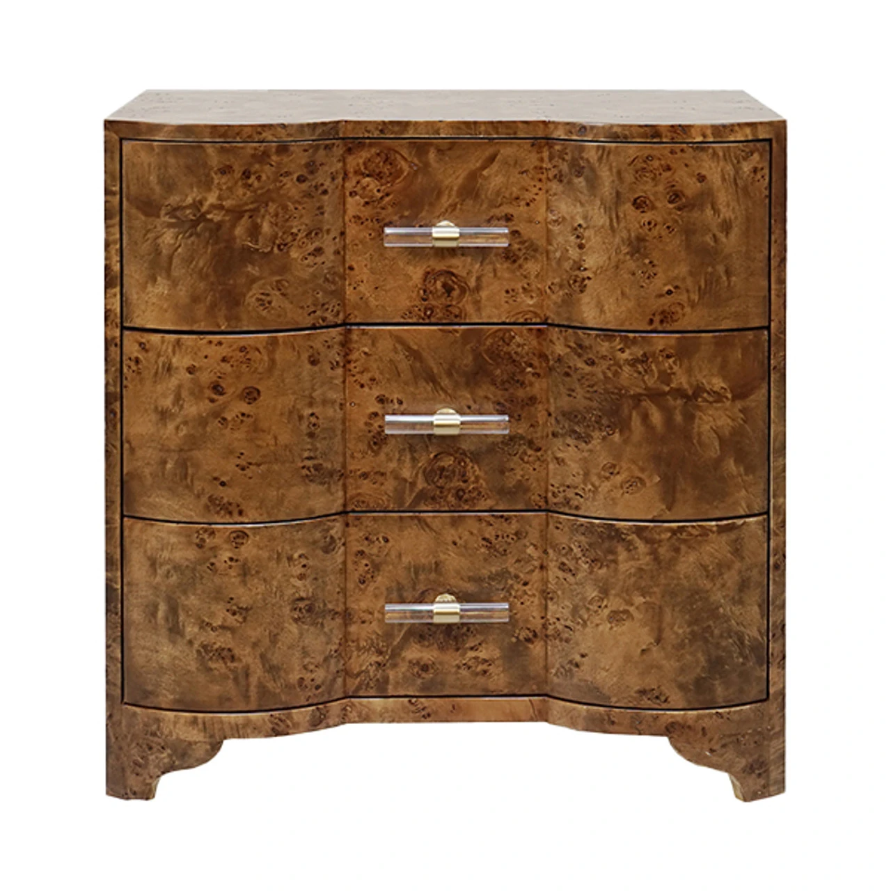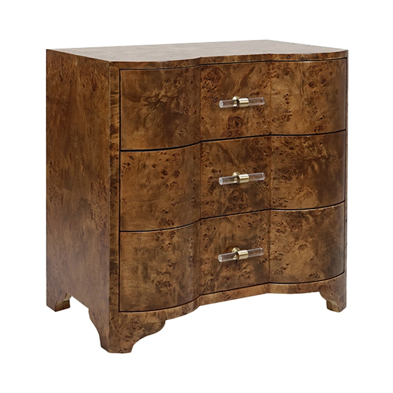 Enjoy the Three Drawer Side Table – Dark Burl Wood – Acrylic Hardware in your home today! Our stunning Calvin three drawer side table is a modern heirloom in the making! Distinctive, serpentine profile is dressed in exquisite, matte burl finish and accented with acrylic cylinder & brass hardware. Three generously scaled drawers make Calvin an elegant storage solution for any interior.