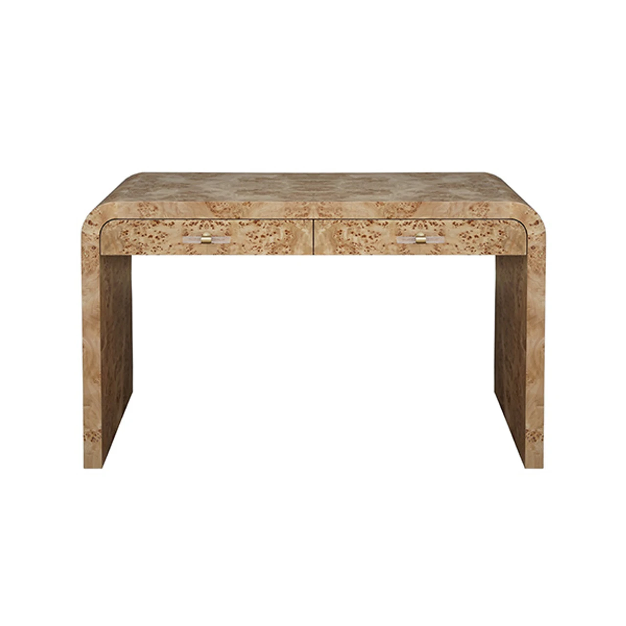 Enjoy the Waterfall Edge Desk – Burl Wood in your home today! Behold the wondrous details of our Petra desk. A gorgeous burl wood veneer with a matte finish cascades down the waterfall edge, and two discreet drawers with acrylic hardware nest within. An immediate upgrade to your work from home style!