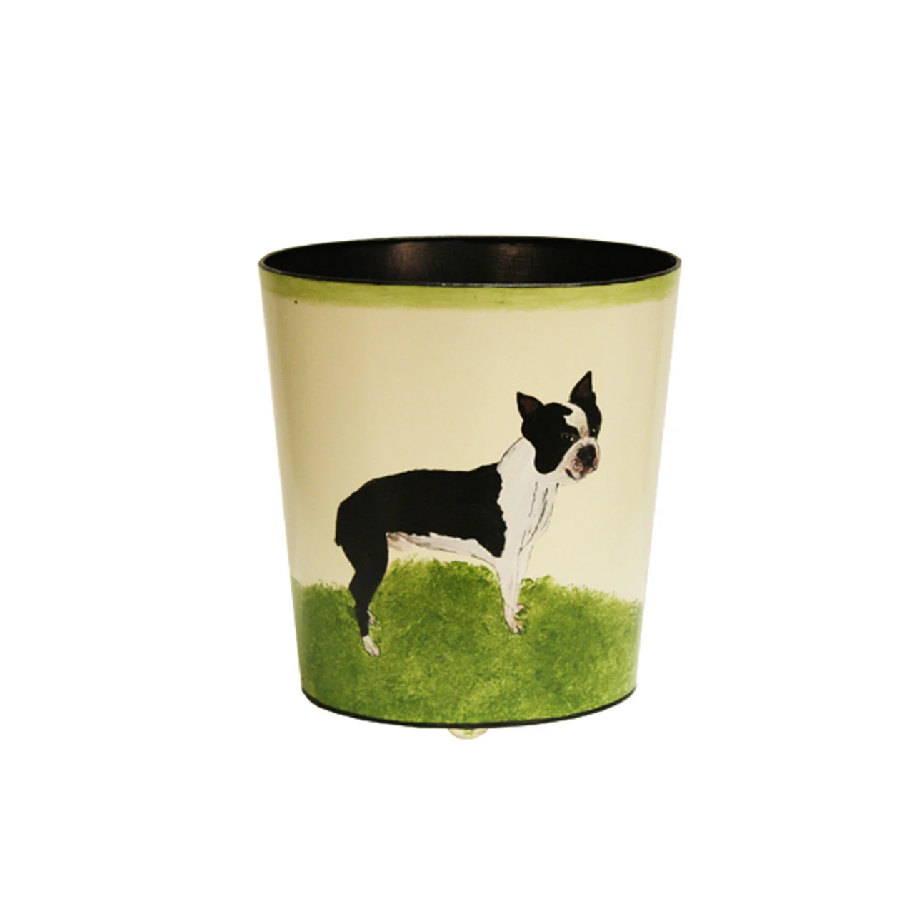 Enjoy the Boston Terrier Wastebasket in your home today! A thoughtful gift for clients and friends (or just in honor of your own fur babies!), our hand painted Boston Terrier wastebasket brings a delightful finishing touch to any room. Contact [email protected] for customization options.