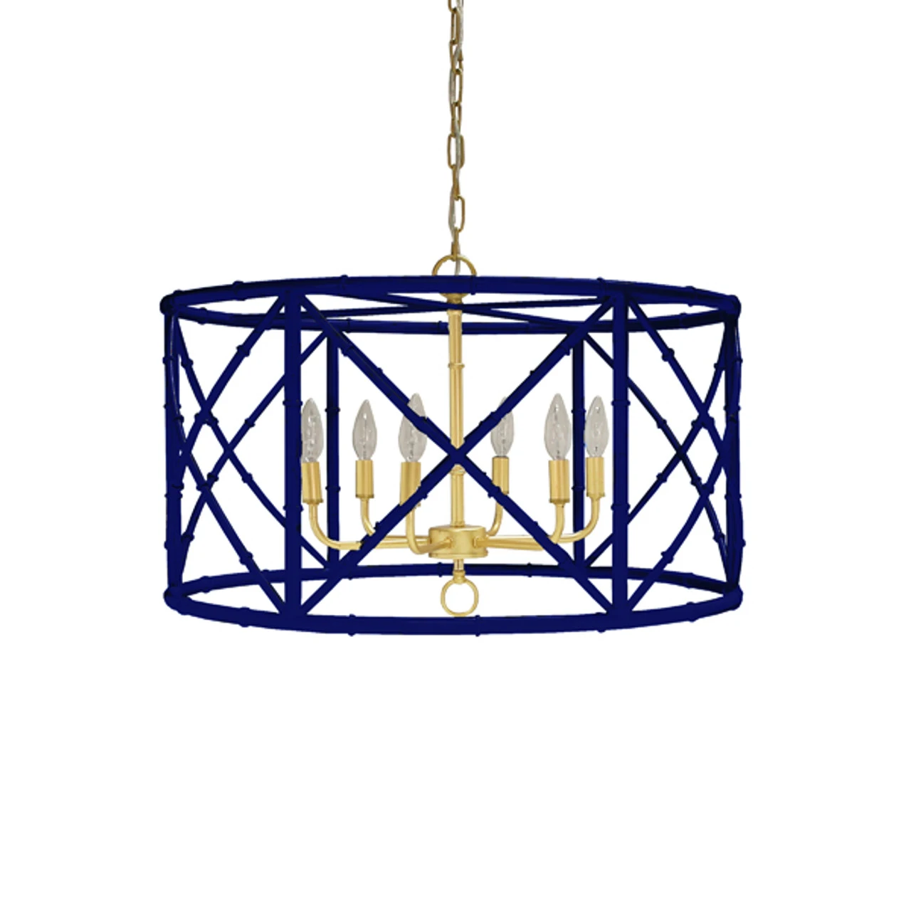 Enjoy the Bamboo Chandelier – Navy W Gold Cluster in your home today! Our popular Zia chandelier features delicately bowed, navy powder coat bamboo arms that criss-cross to form a stylish drum scaffolding around a brilliant gold light cluster. Includes six feet of coordinating chain and canopy for your custom installation.